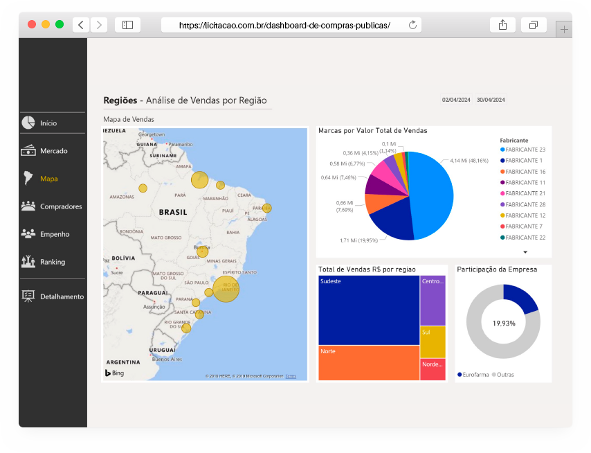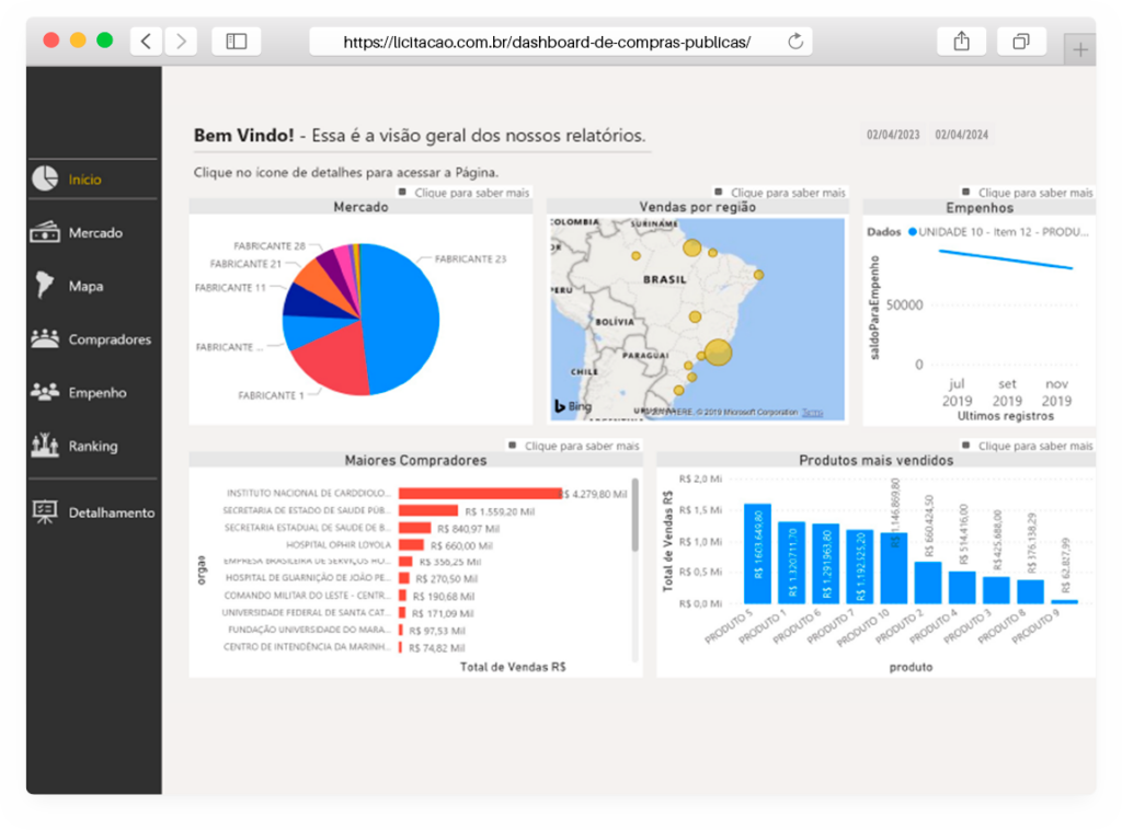 Com o Dashboard de Compras Públicas sua empresa tem acesso aos resultados das licitações do seu segmento com informações detalhadas. Como produto, quantidade, valor, empresa vencedora, entre outros.
